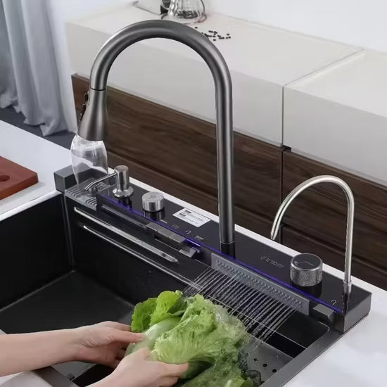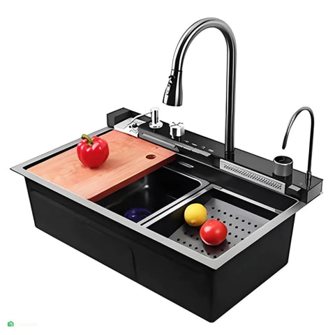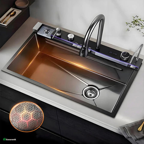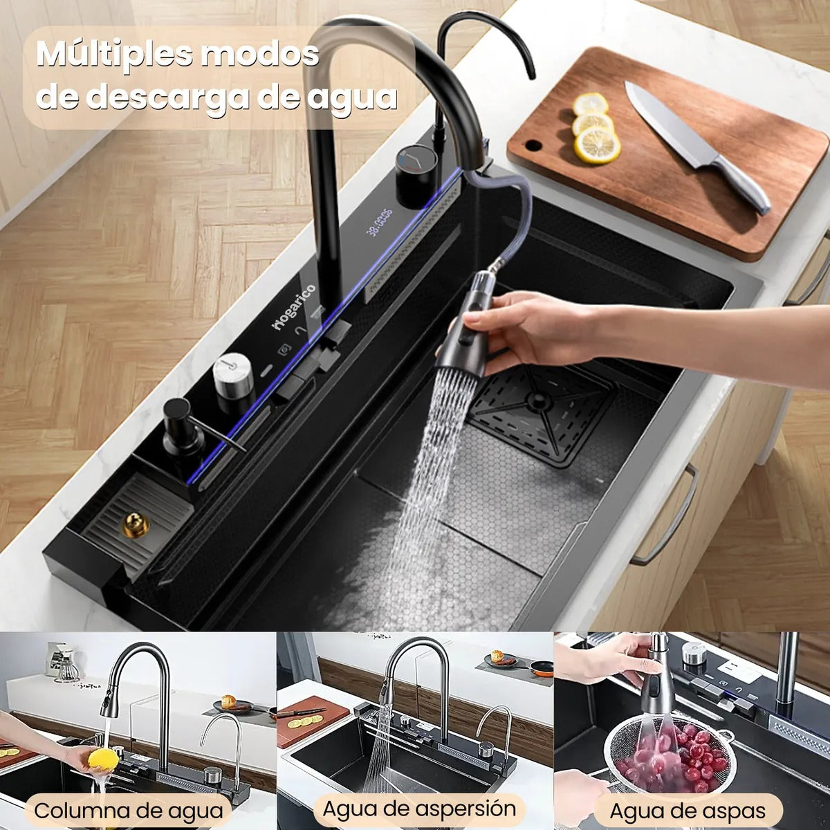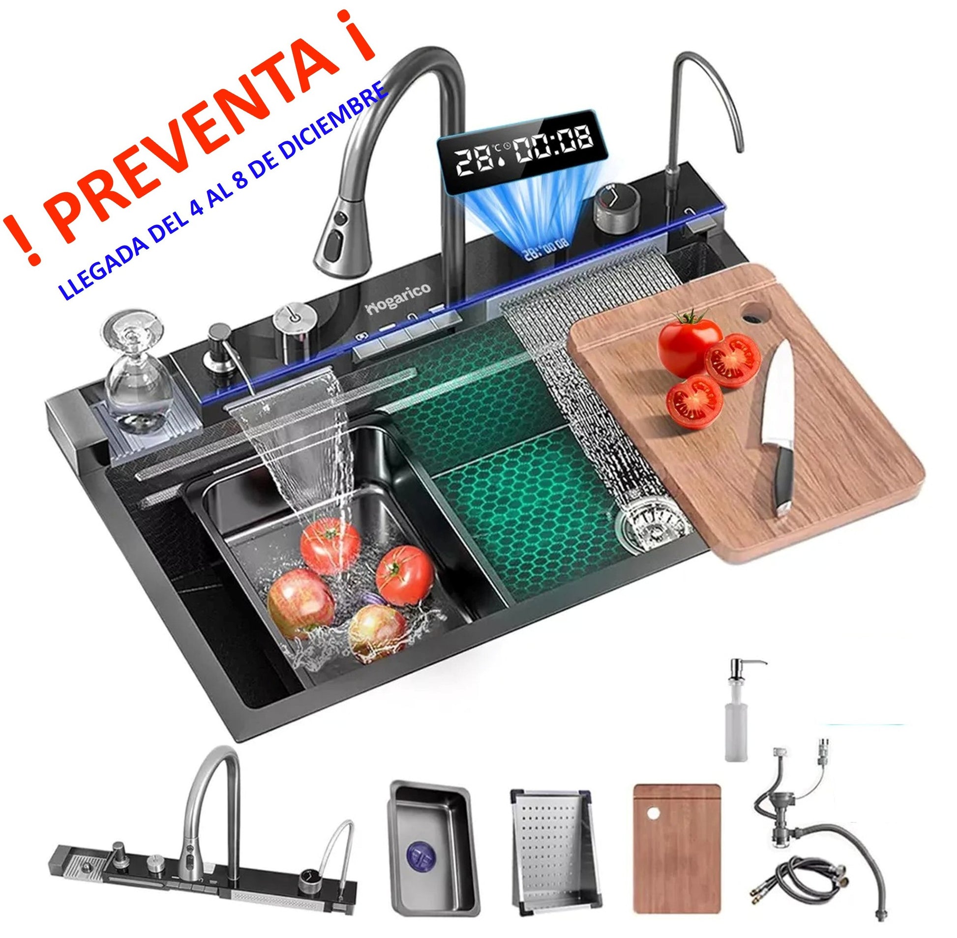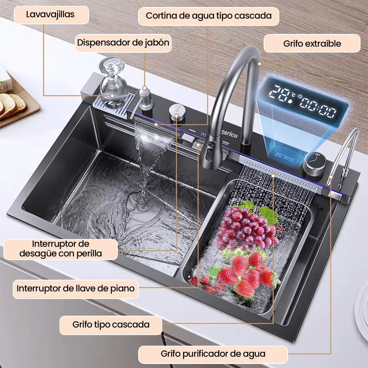 Convierte tu cocina en un área moderna y práctica con el Lavadero Inteligente 7 en 1 , fabricado en acero inoxidable nano 304 premium , resistente a la corrosión y con acabado elegante en negro mate.